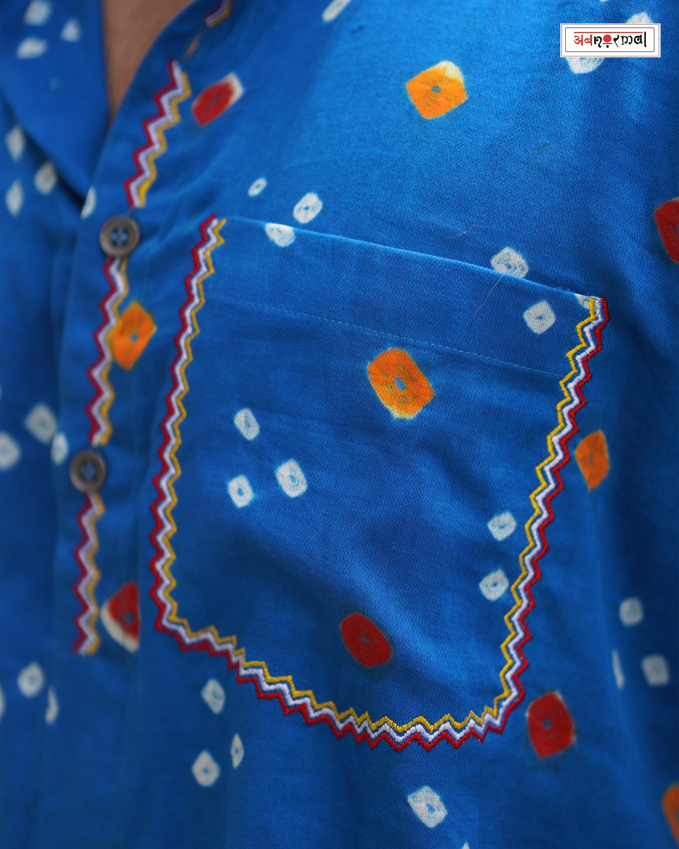 Short kurtas in cotton & satin mix with handmade Bandhani. Delicate embroidery detailing in bandhani colors on button lapel, sleeves & pocket for some added glamour.