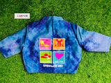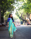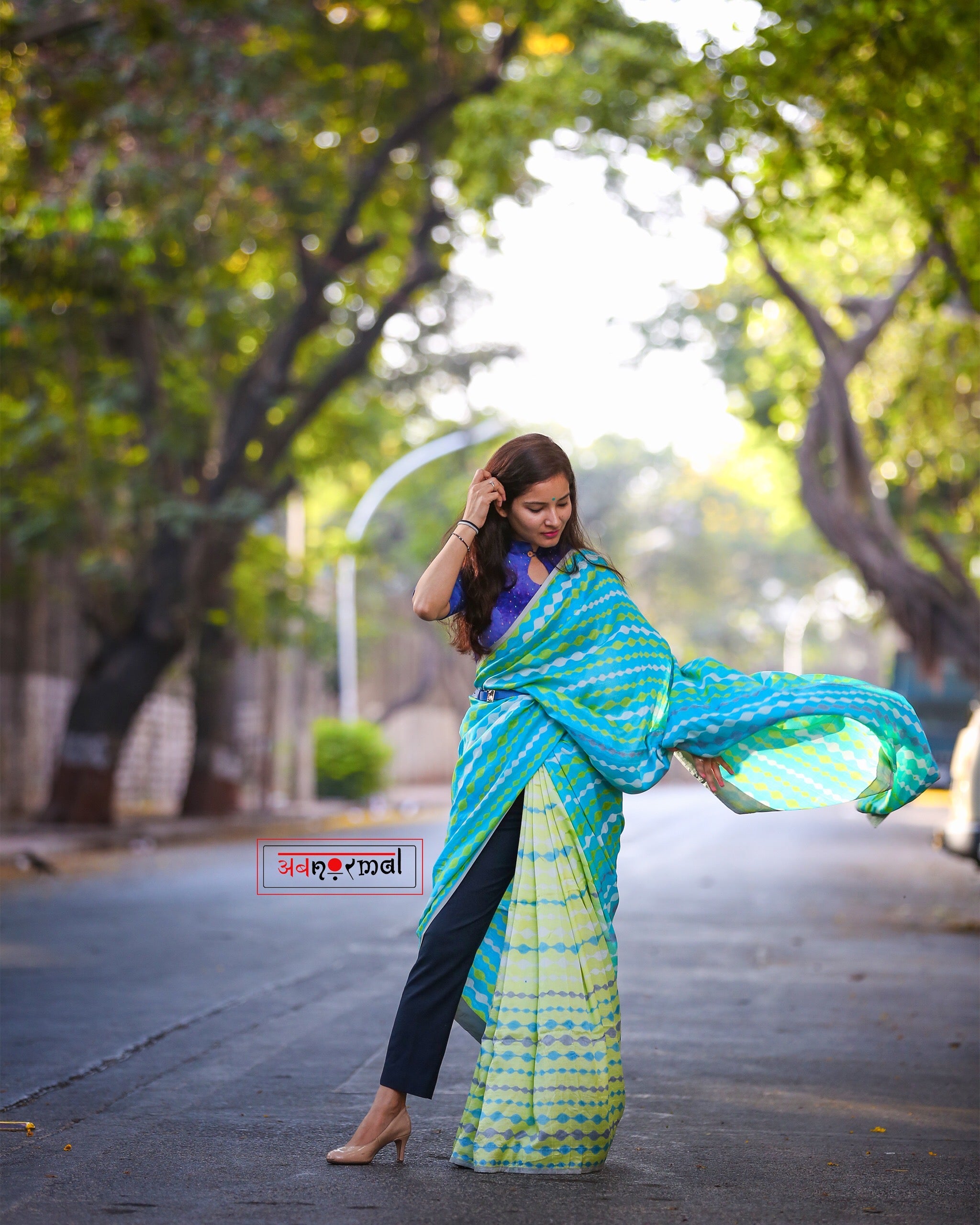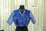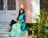 Material - a cotton tie & dye in shades of blue with fluorescent color woven buttis.