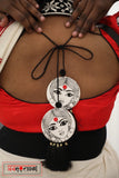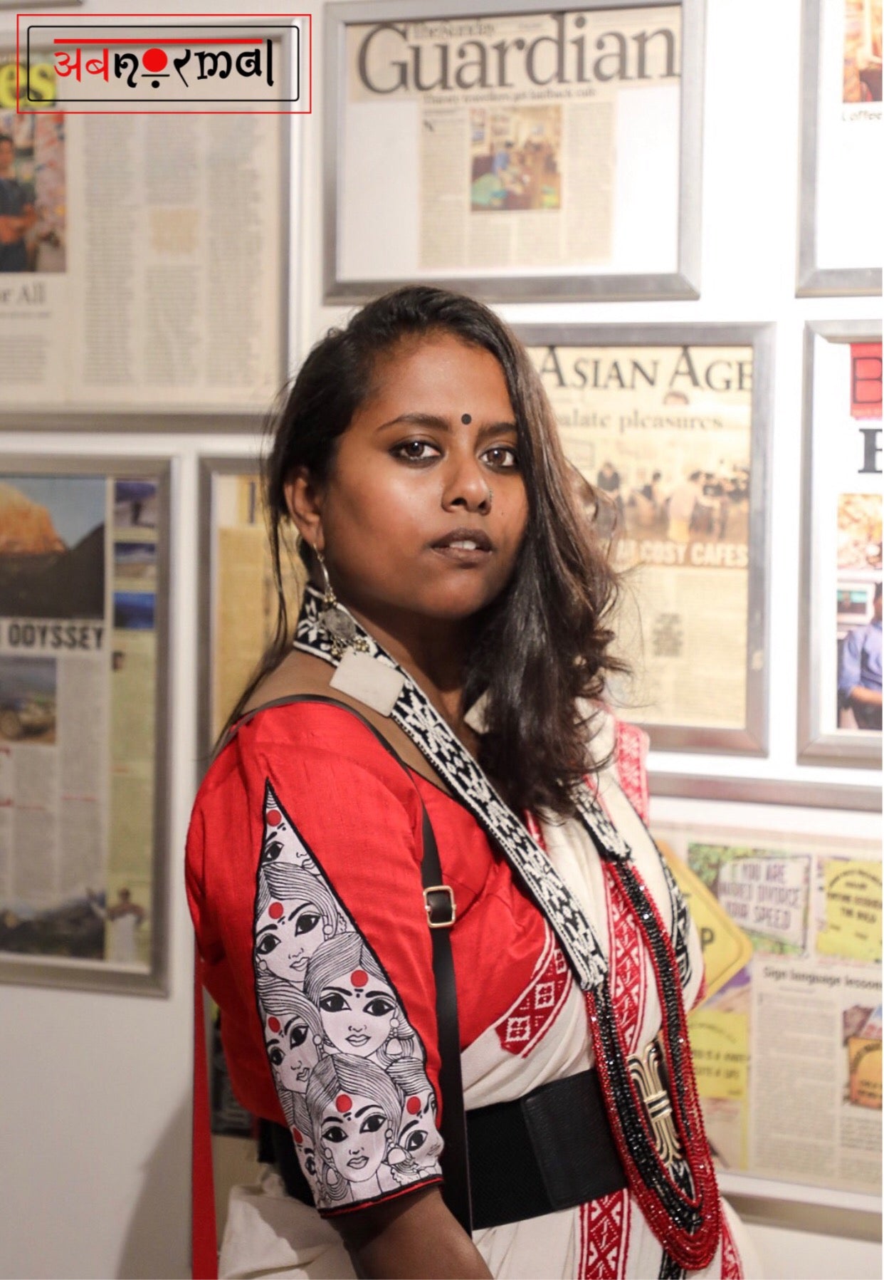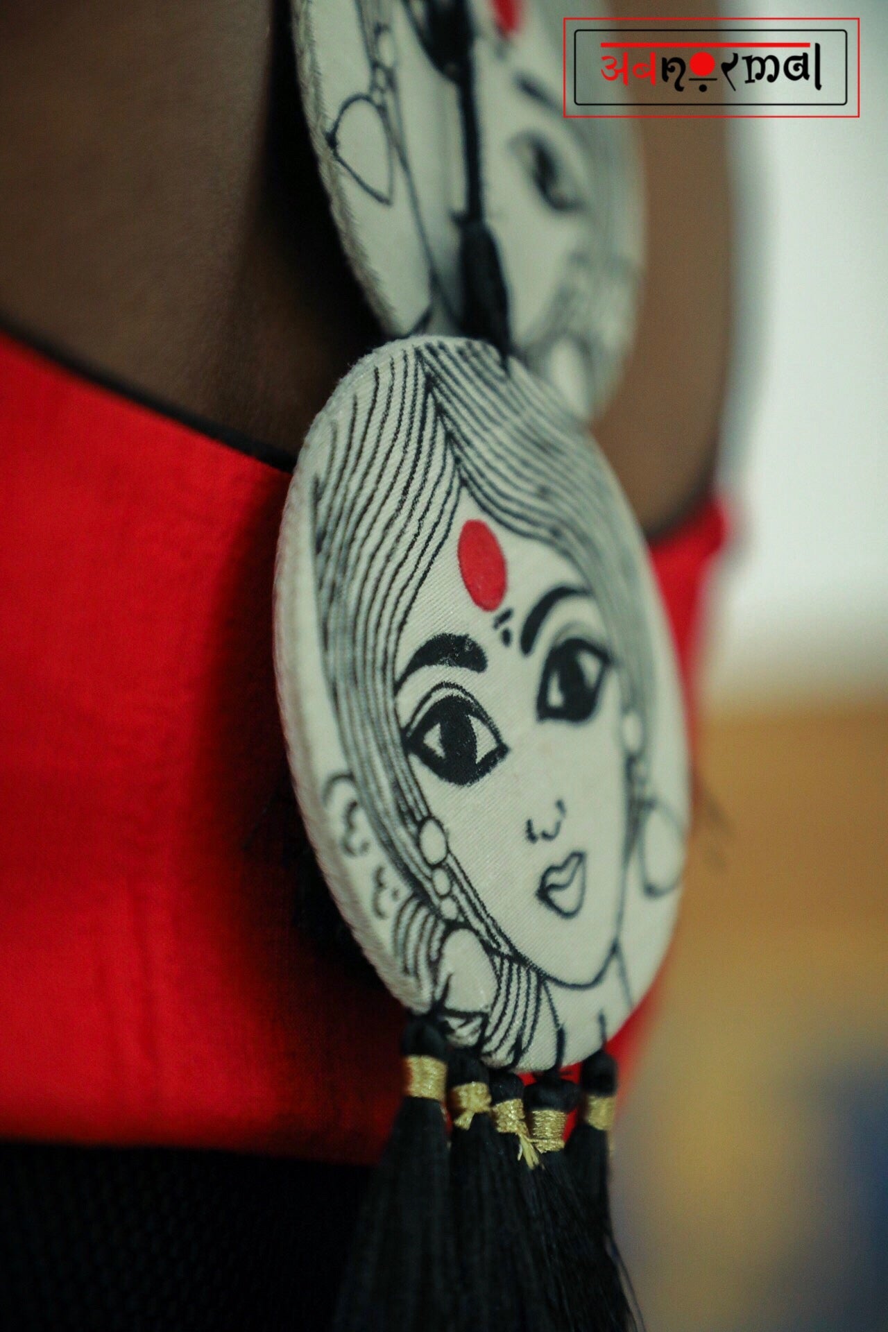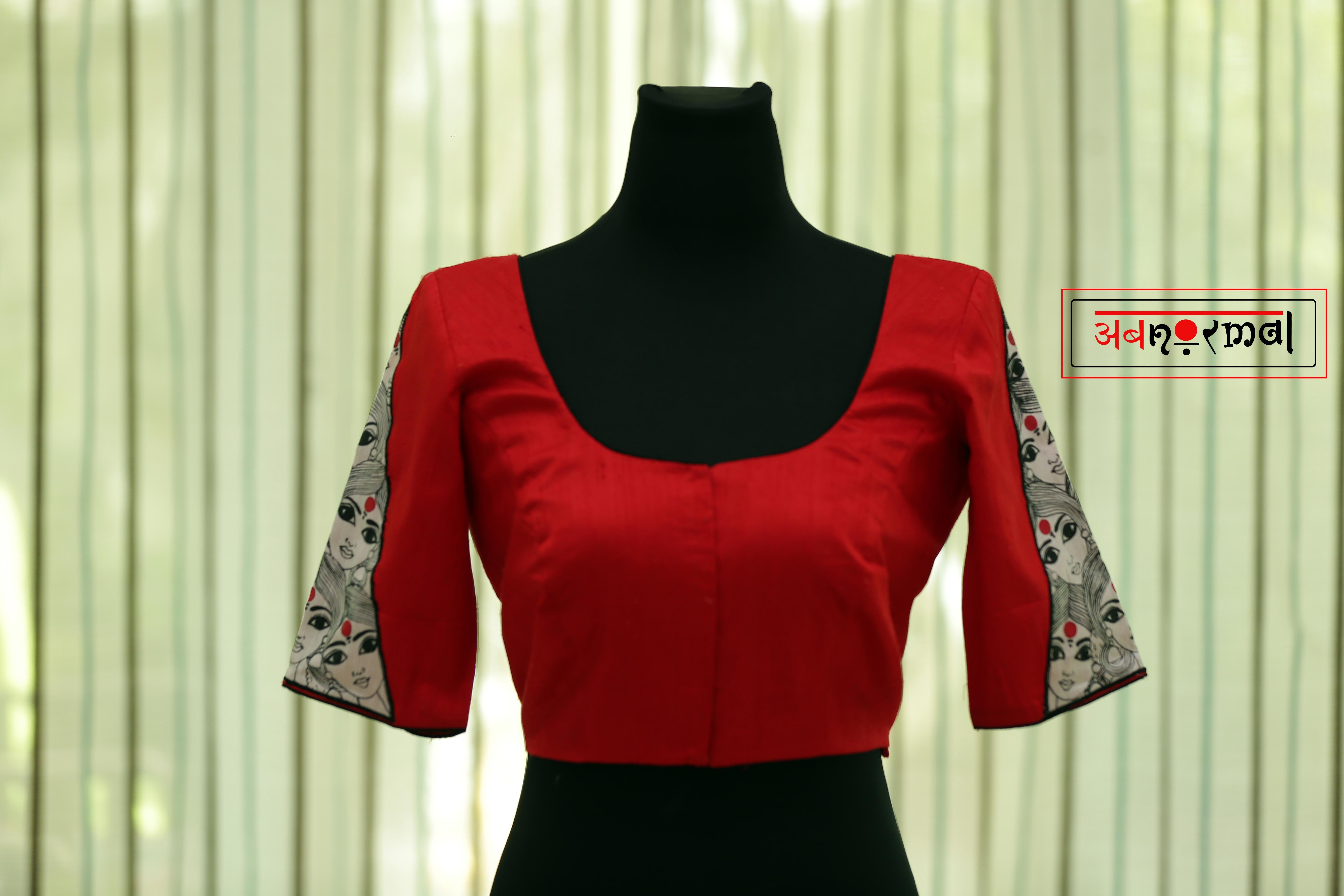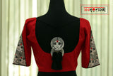 Presenting our humble tribute to womanhood; the “Sthree Shakti” choli; fully hand painted faces of ladies with red bindis appliquéd on both sleeves. Hand painted big tassles with latkans at the back.