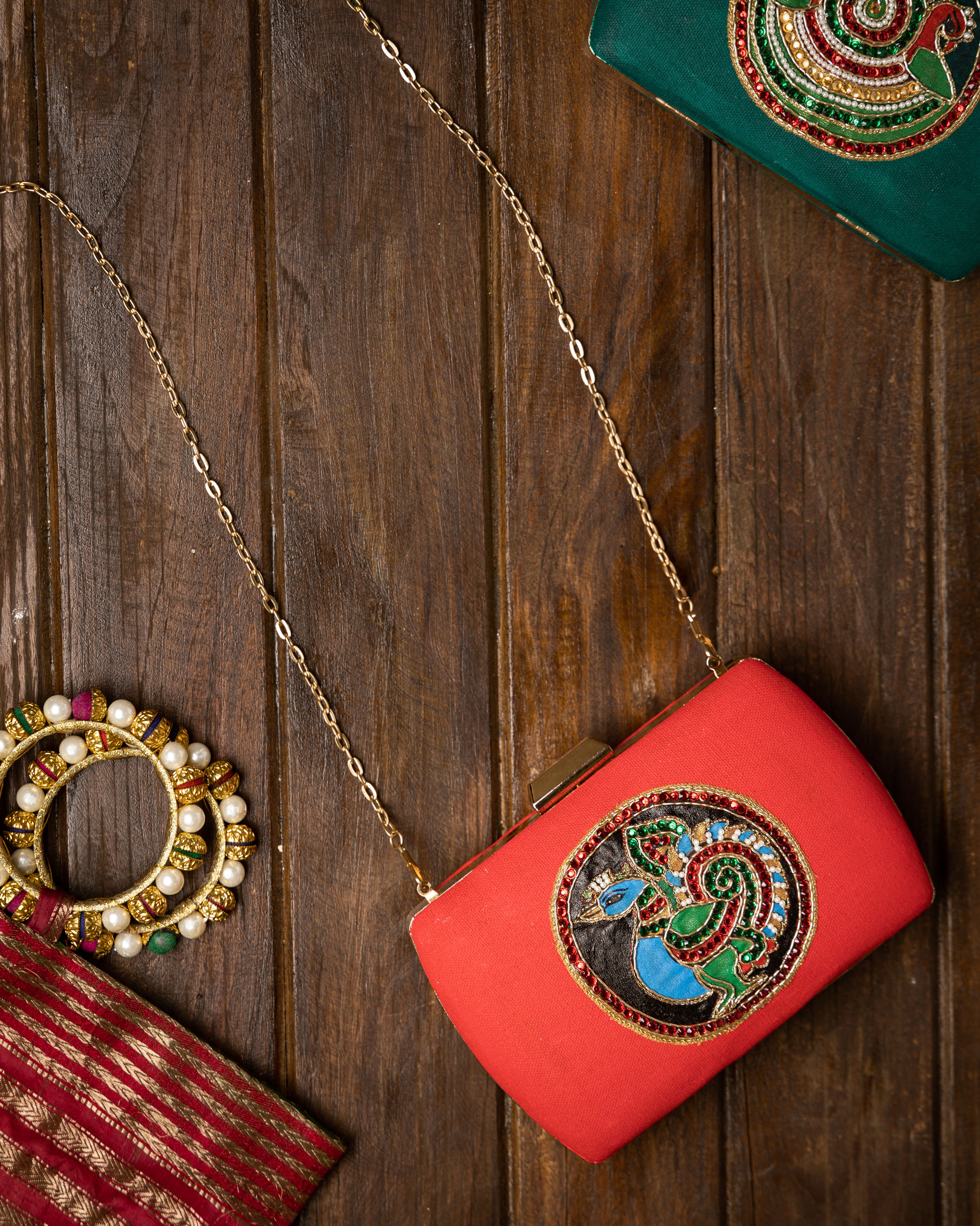 Presenting “Mayil Clutch“ from our Tanjore paintings inspired series of handmade clutches in a zara hatke & completely HANDPAINTED /HANDMADE style that is oh so अबnoरmal!