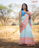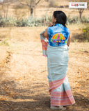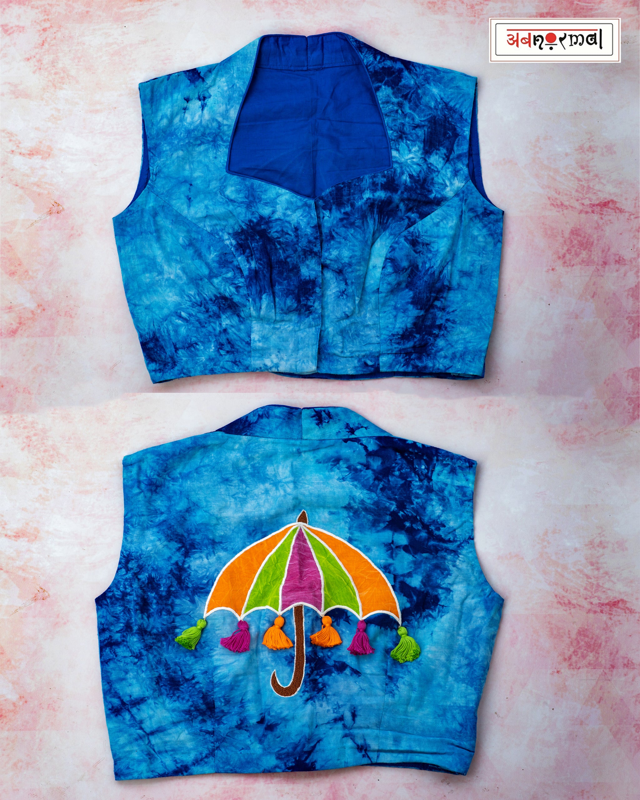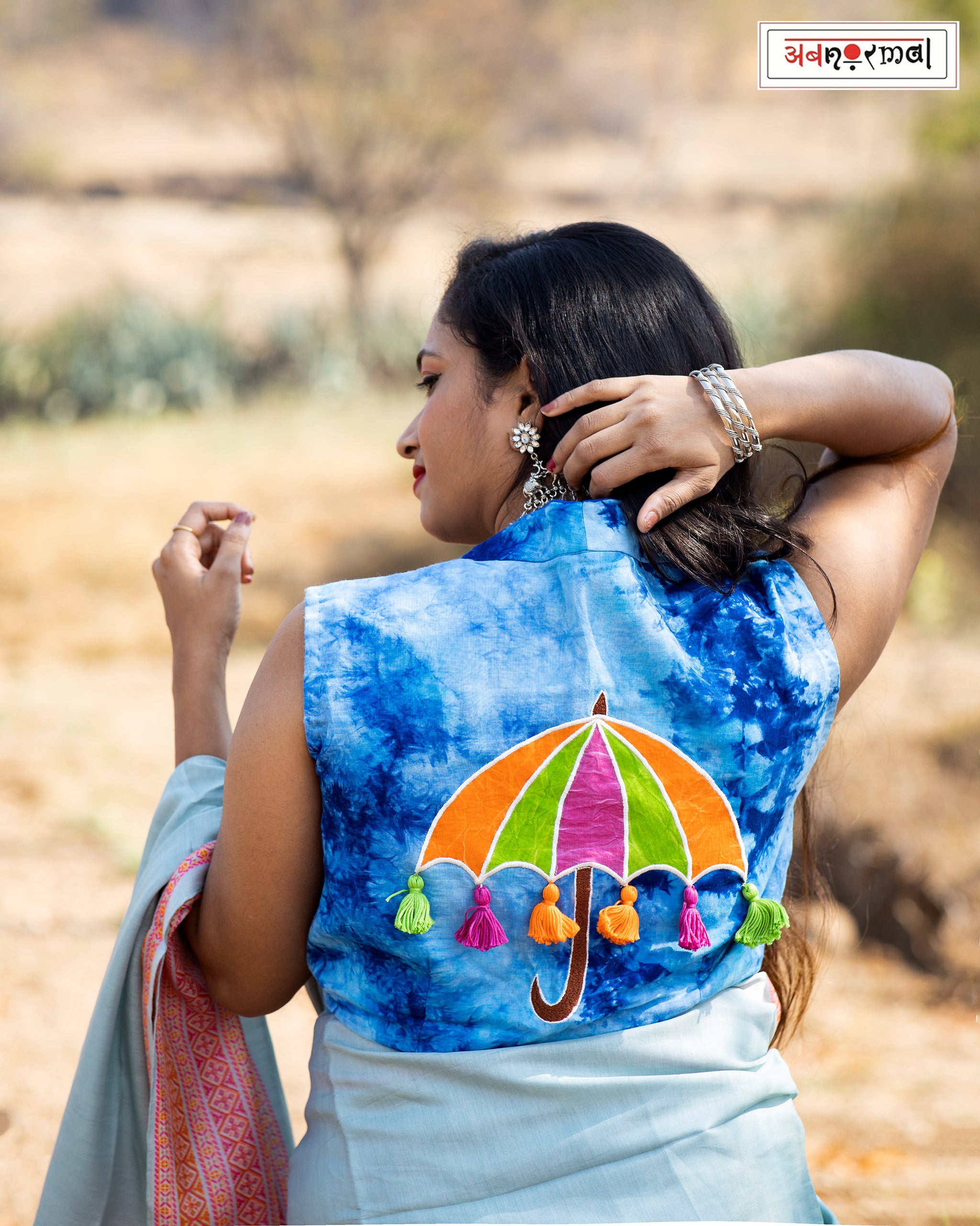 Presenting “Haaye Garmi” a stylish sleeveless Choli that has a clear blue skies look in batik cotton modal & a big colorful handmade patchwork appliquéd Umbrella with pompoms.