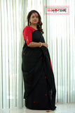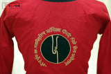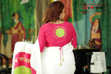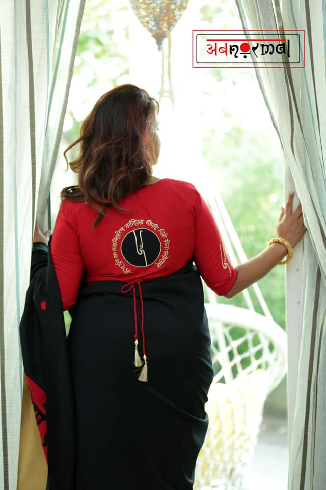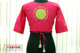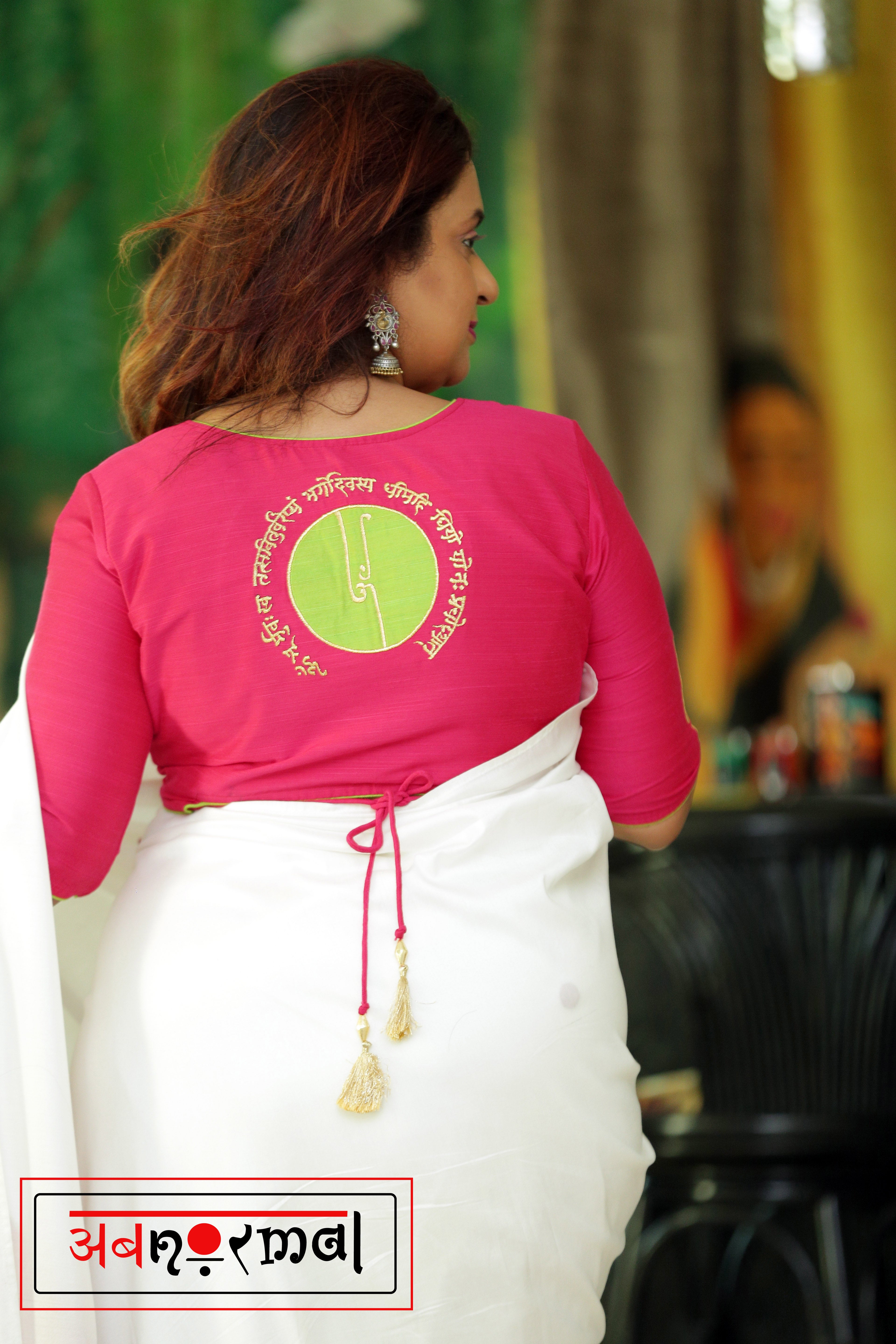 Cholis in pure handloom silk cotton with a massive embroidery of the Gayatri mantra appliqued. Not just that, the choli has cute tassle tie back detailing!