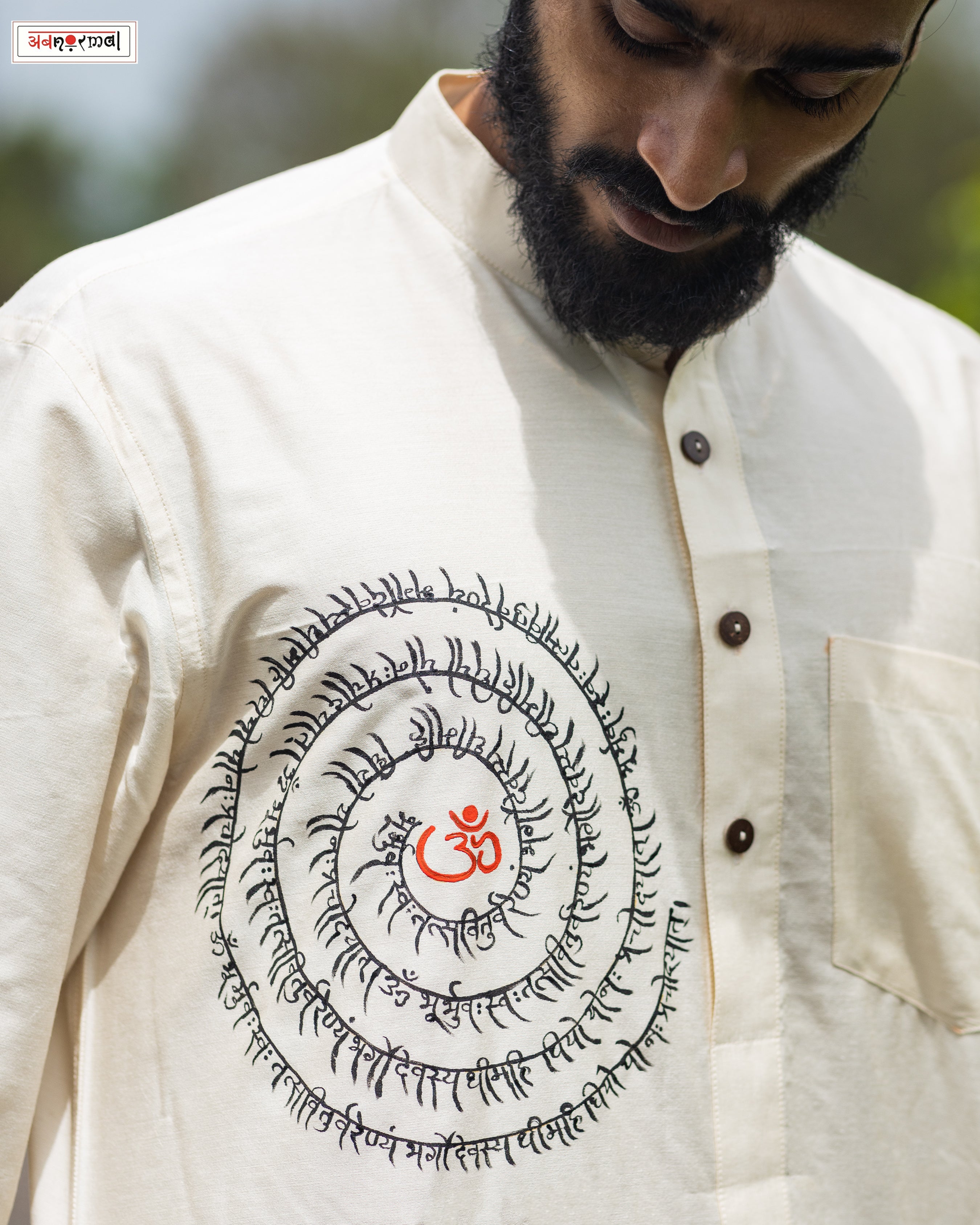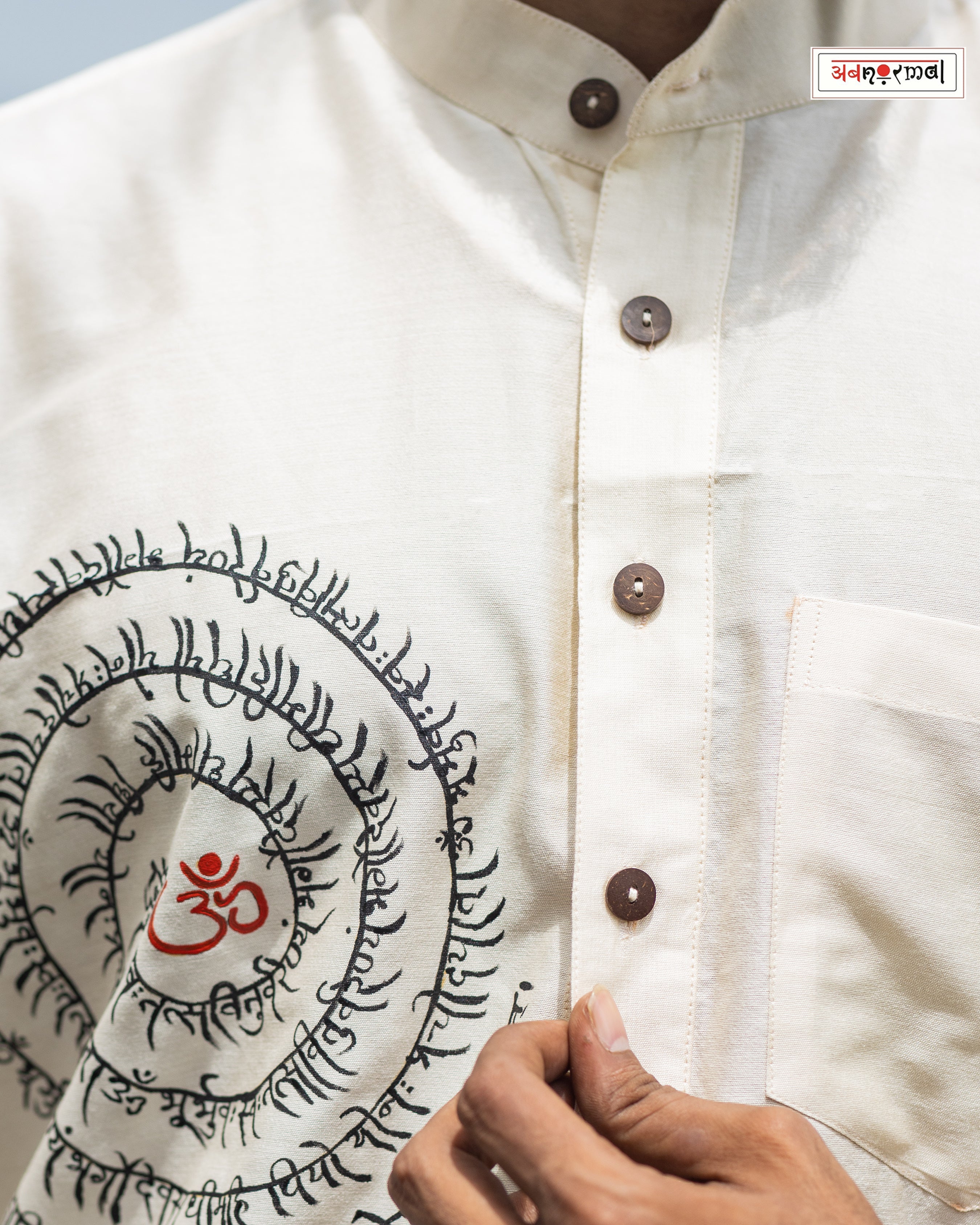 Short kurtas in pure handloom silk cotton with the Gayatri mantra calligraphy in a spiral form handpainted on the right, a pocket on the left, buttons in the centre & a Chinese collar.