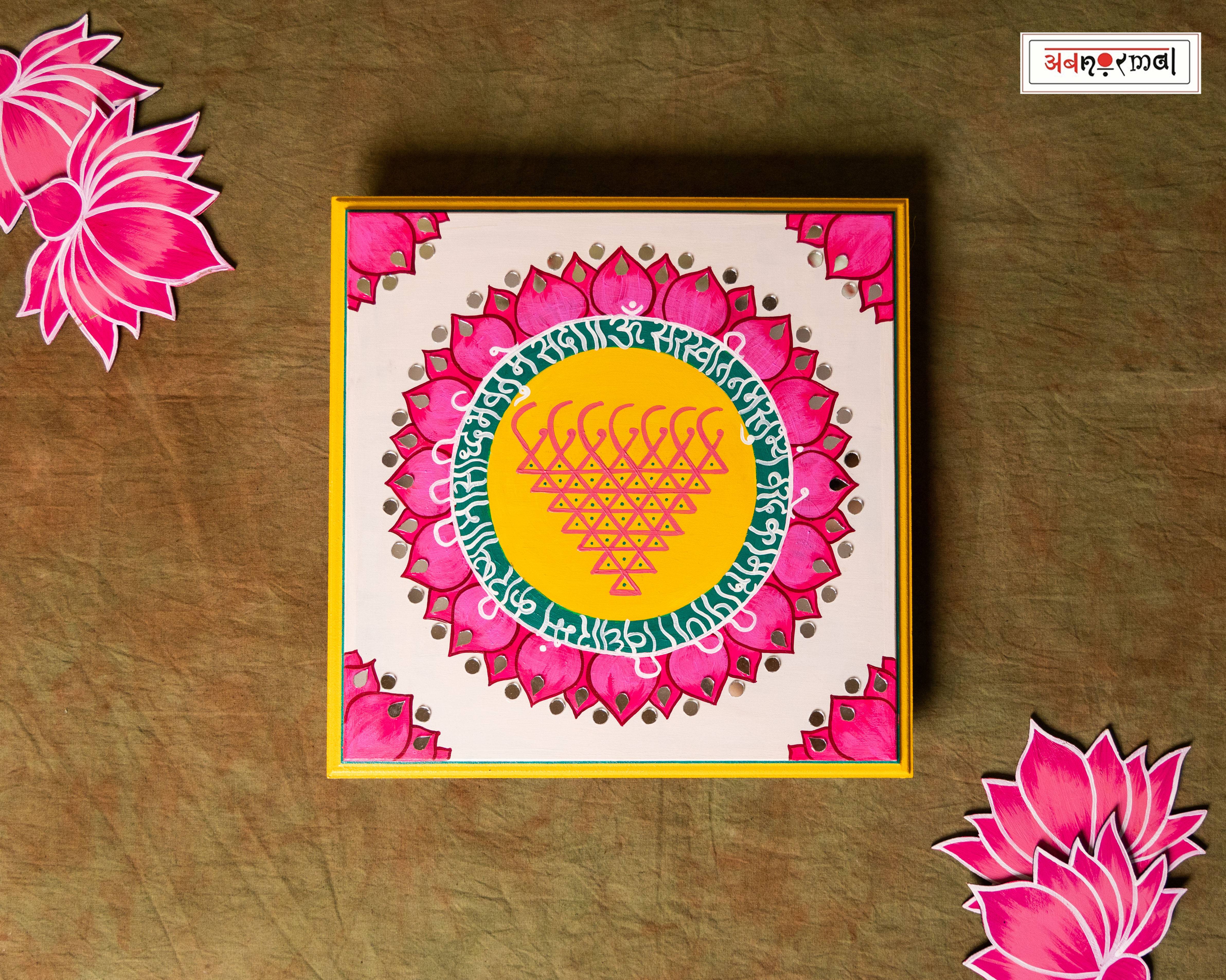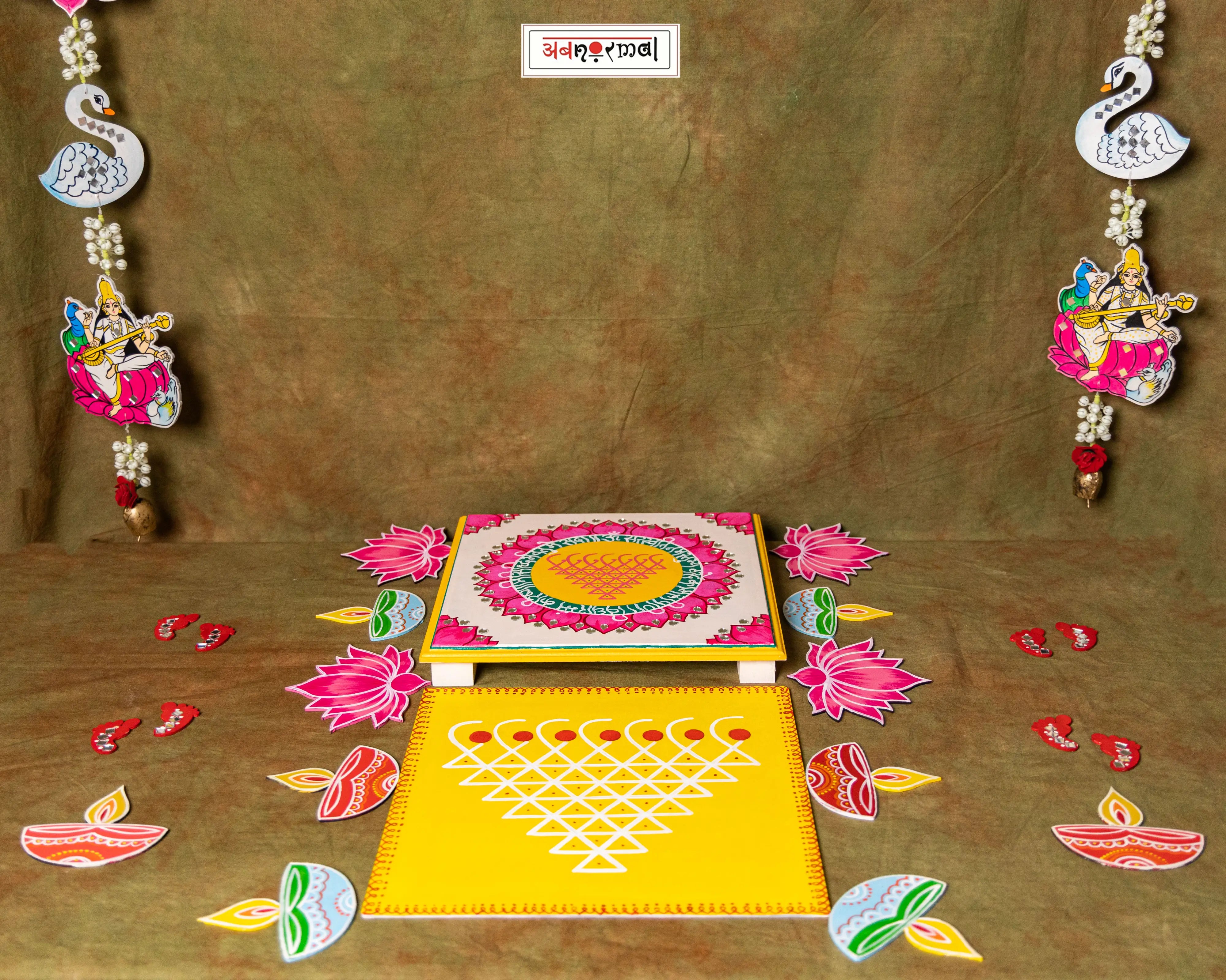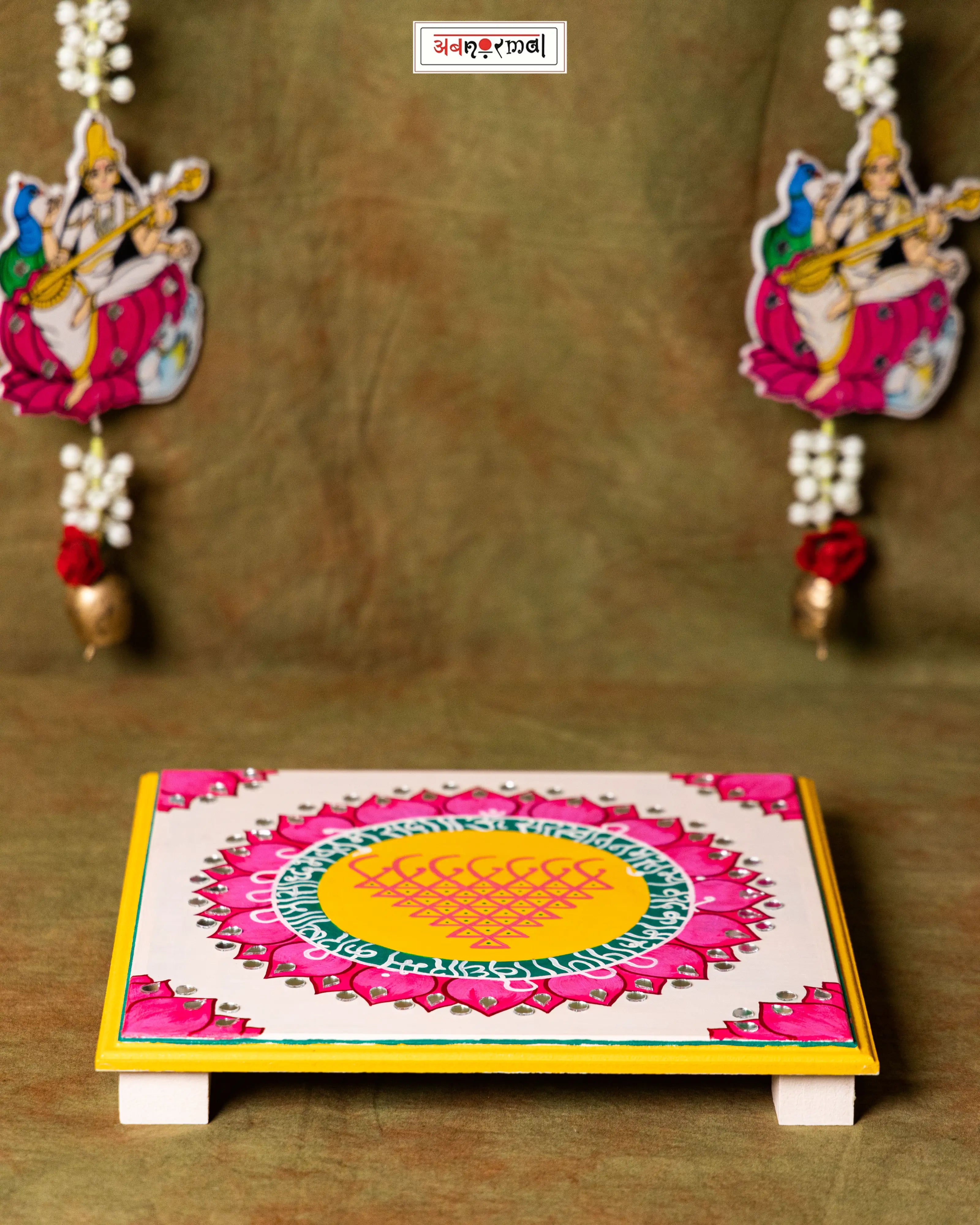 Presenting “Saraswati Pooja Chowki” or Paat; a square floor stool slightly raised on 4 blocks, that serves as a beautiful base for Saraswati Pooja. Fully handpainted on a white base are Lotus petals with the Saraswati Shloka on the carpel & a Saraswati Kolam inside the seed pods; embellished with ablas. Lotus on all 4 corners to give the Chowki a finished look. Popular iconography & colors one would associate with Maa Saraswati are used in this Chowki.