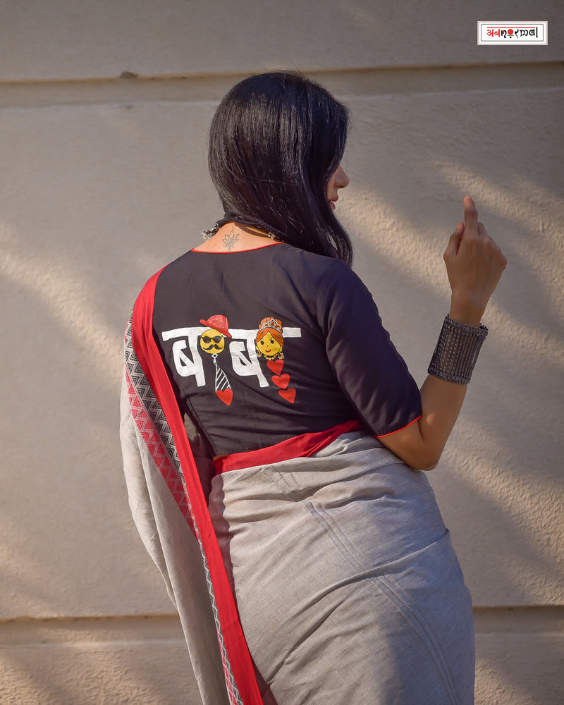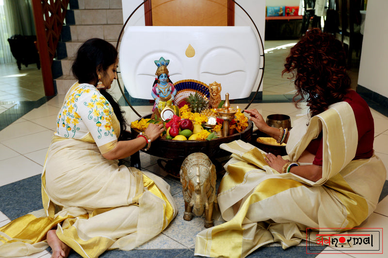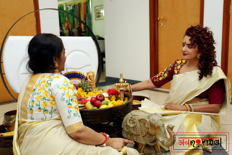 The Kanikonna choli in kasavu cotton with a burst of the Vishu Konna in full bloom that sits prettily on your shoulder, making your ensemble stand out from the rest. NOTE: Sari is model's own and is not for sale....