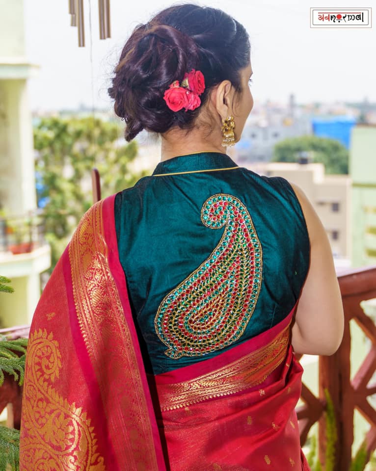 This grand Persian Paisley or Ambi or Mankolam with intricate ari, red & green beads makes for a stunning & royal fashion statement. NOTE: Sari is model's own and is not for sale. [custom tab] Paisley is an ornamental textile...