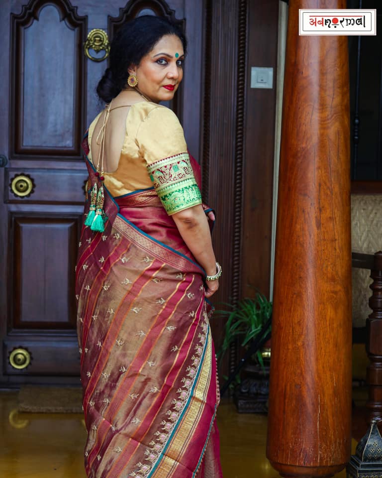 Like “Kasturi” the musk deer that goes mad searching for the scent of musk around it, not realizing that the essence comes from within... be the cynosure of all eyes in our pure Benaresi katan silk with Paithani motifs in...
